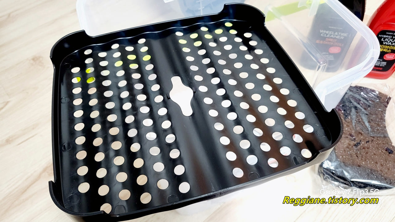 아쉬운 점은 그릿가드의 하부 지지가 네 곳의 귀퉁이만 있을 정도로 부실하여, 세차용품을 넣을 때마다 휘어지는 듯한 느낌이 든다는 것입니다. 불스원에서는 모서리뿐만 아니라 중앙 부분에도 하부 지지를 추가해 더 안정감 있는 디자인을 만들어주면 좋을 것 같습니다. 견고한 느낌이 들게 말이죠
