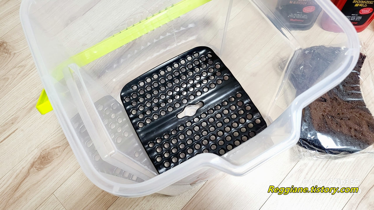 카샴푸를 풀어둔 상태에서 워시미트나 스펀지를 담갔다 빼는 과정에서 이물질이 버킷에 빠질 경우, 그릿가드가 버킷 하부까지는 물 흐름을 제한하여 이물질이 떠오르지 않게 방지하는 역할을 합니다