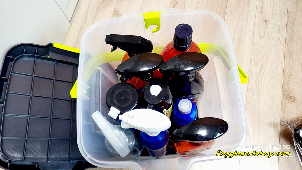 다만, 원형의 용기보다는 불스원 제품들처럼 납작한 용기가 어울리는 것 같습니다. 납작한 용기가 다양한 세차 용품을 효율적으로 수납할 수 있어 더욱 실용적으로 보입니다