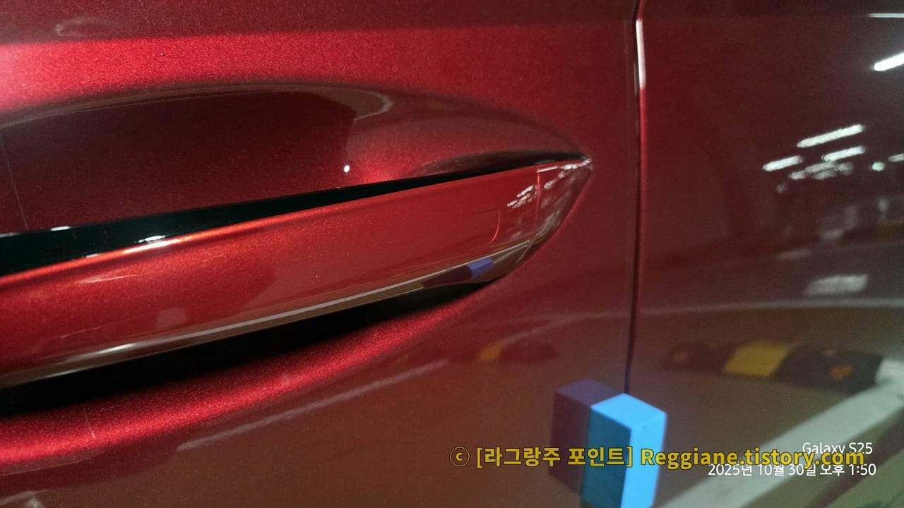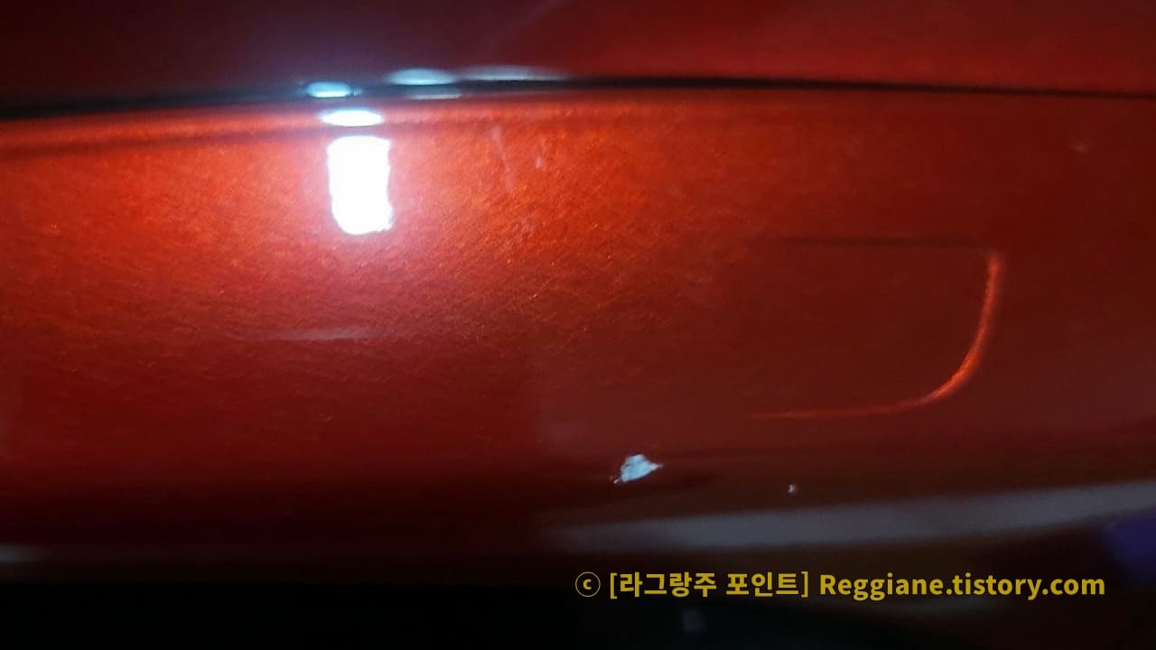 하지만 눈에 잘 띄지 않는 부위이고, 페인트가 건조되며 미세하게 튀어나온 부분은 세차 이후에 왁스 작업을 반복하면 자연스럽게 평탄화될 것으로 예상되어, 페인트 재작업은 하지 않기로 결정했습니다